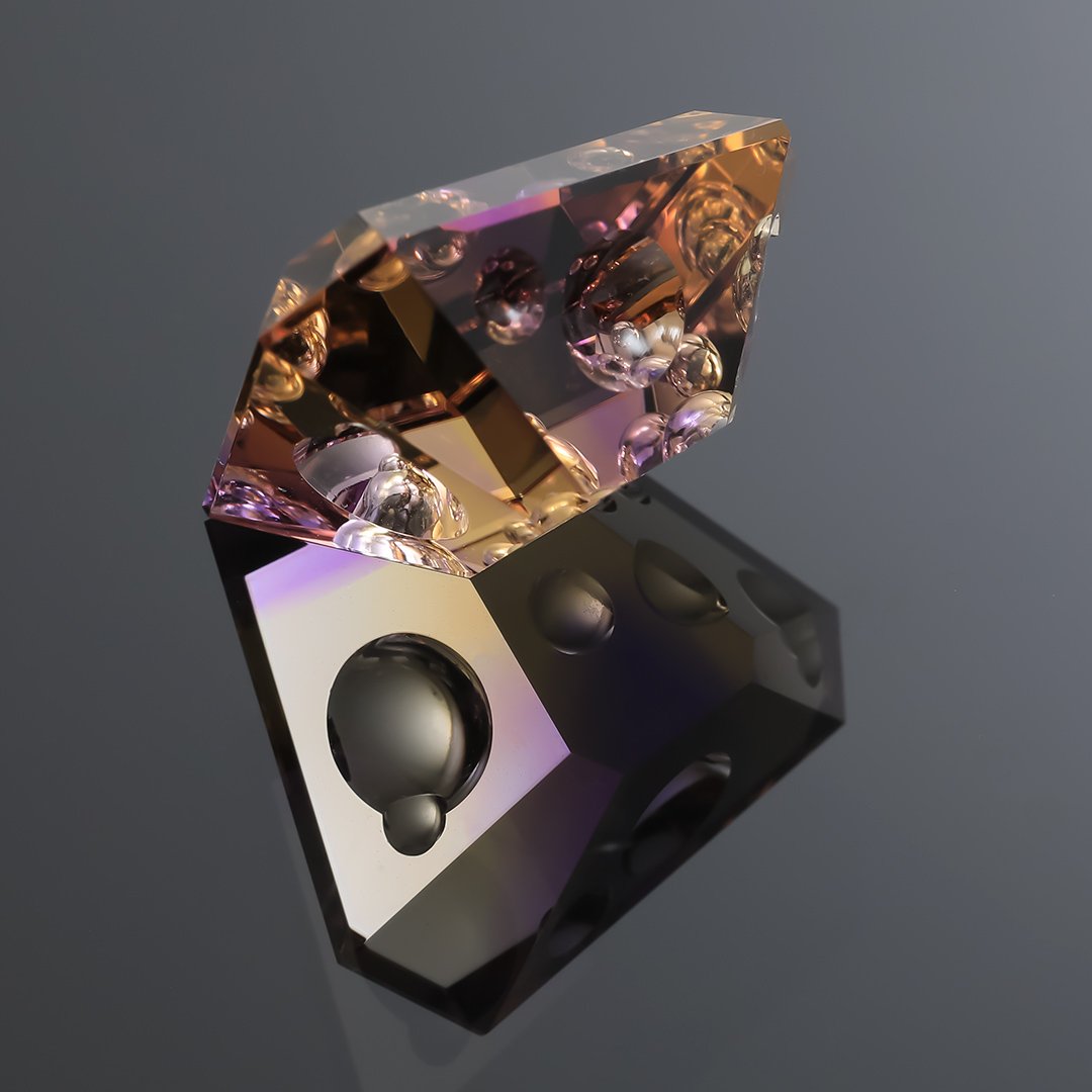 I have worked this gem into one of my Innerscape cuts with lots of bubbles and it was a lot of fun to create. It is a large gem but relatively shallow for it’s length/width spread so it would be perfect for an imaginative ring or pendant setting.