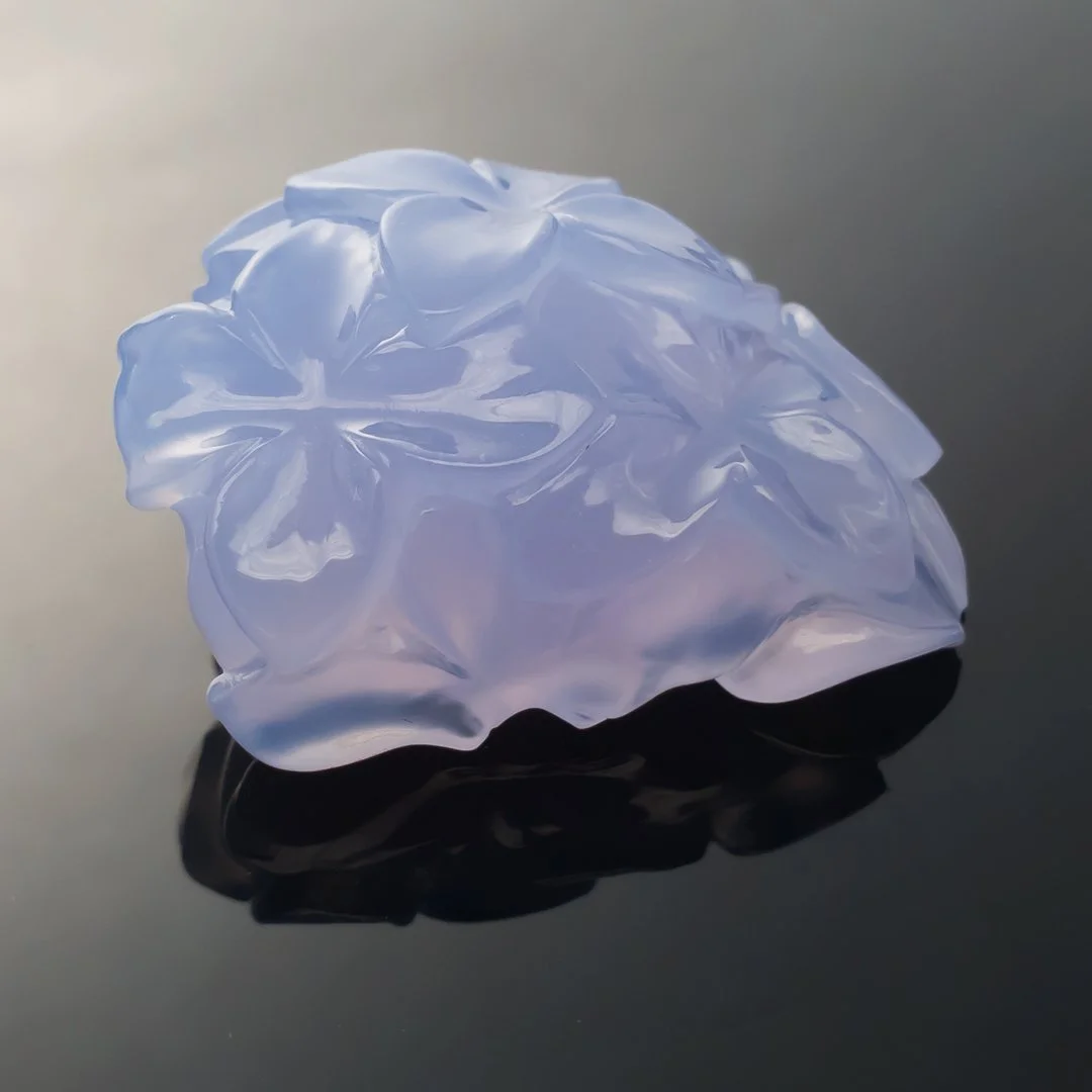 This fine piece of Turkish Blue Chalcedony was just the perfect colour for carving a bloom of hydrangeas. It was a challenging piece to carve but very enjoyable at the same time. I've always been fond of hydrangeas and their big beautiful blooms are just wonderful, there are some in the garden now. This carving could be worked into a brooch or another feature piece of jewellery. The blue chalcedony from Turkey is considered to be among the best of it's type in the world and it has a soft gentle translucent glowing quality about it.