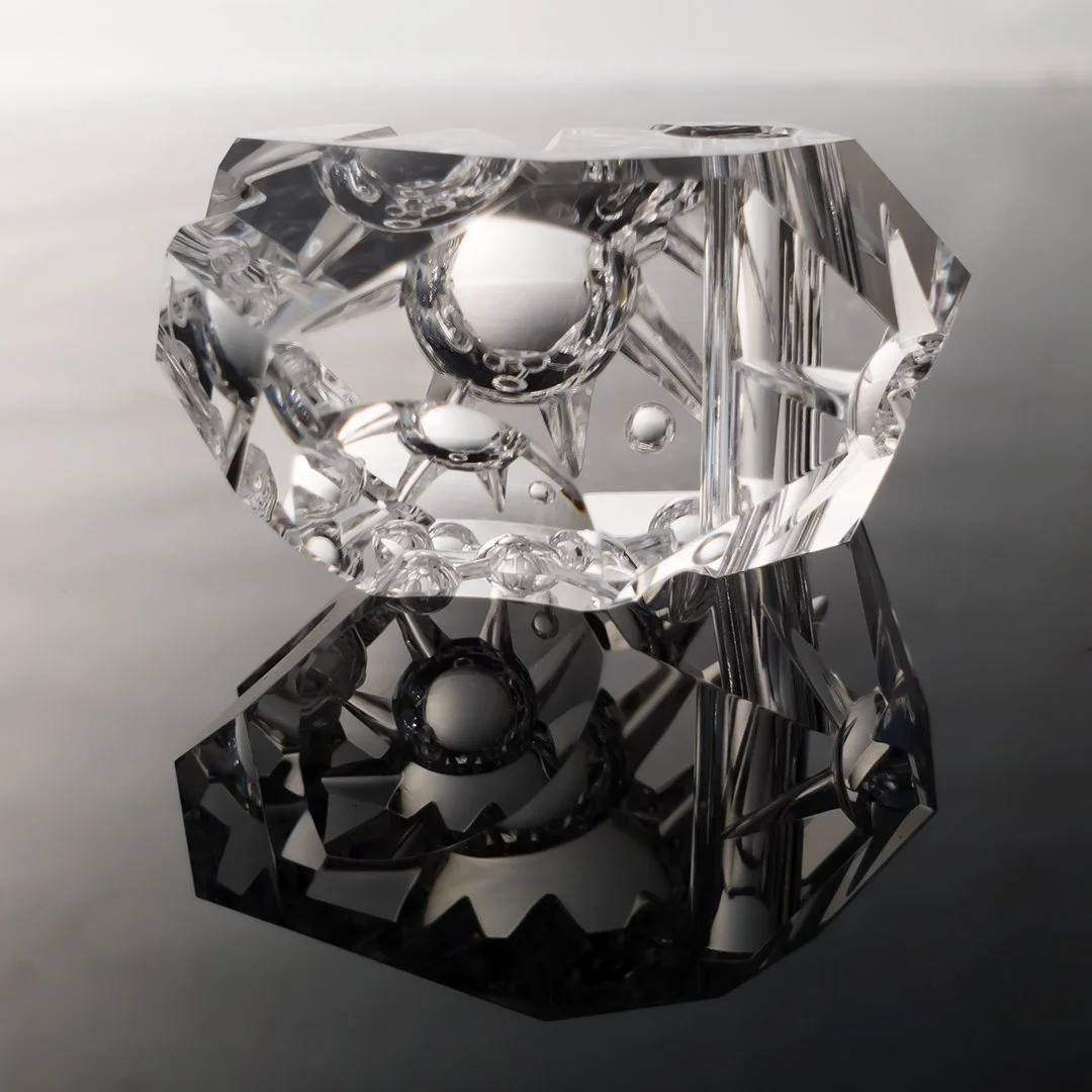 The second in my Psychonaut series of small sculptures which pays homage to one of my favorite movies, Contact. This small sculpture was made from a fine, clear rock crystal. It features my little psychonaut astronaut traveling through the cosmos witnessing celestial events, suns and interconnected nodes of consciousness. The rock crystal's inner surfaces reflect shifting views of it's reality as you move it around and see into it from different perspectives. I've included a polished hole through the small sculpture so that it can be worn as a pendant if desired or it can be kept as an objet d'art.